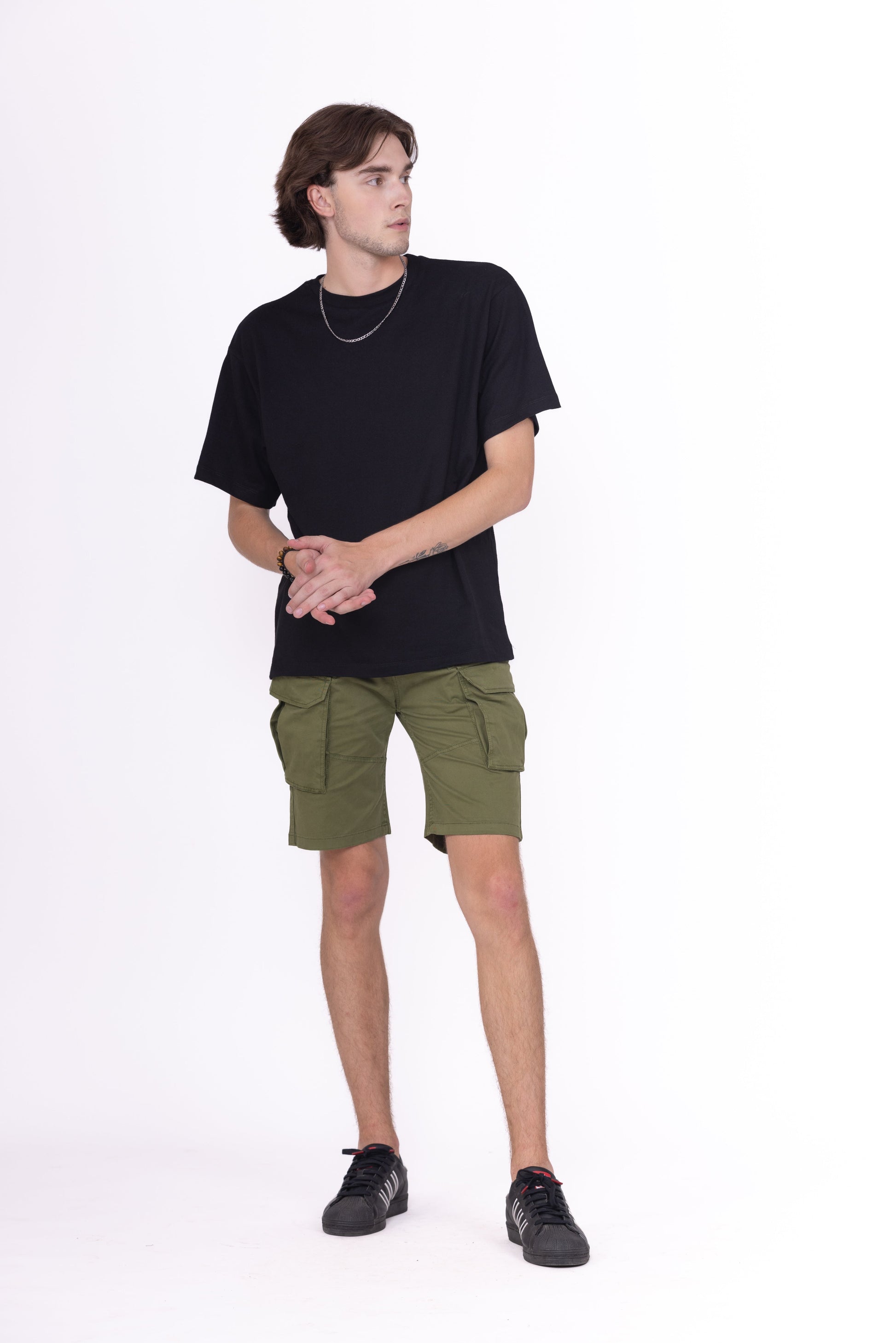 Slim fit half Pants . Front pockets and rear patch pockets. Patch pockets with flaps on the legs. Front zip fly and button fastening.