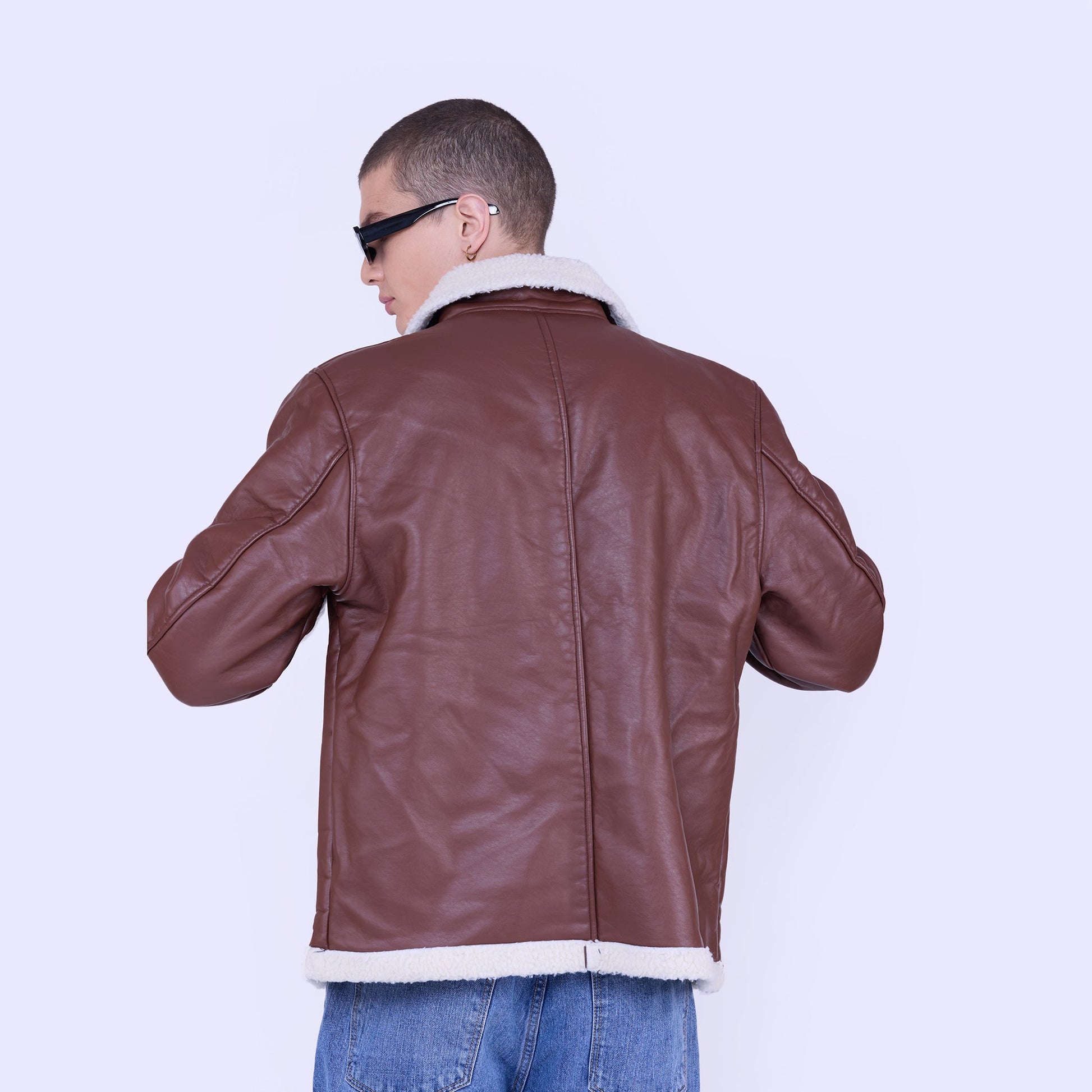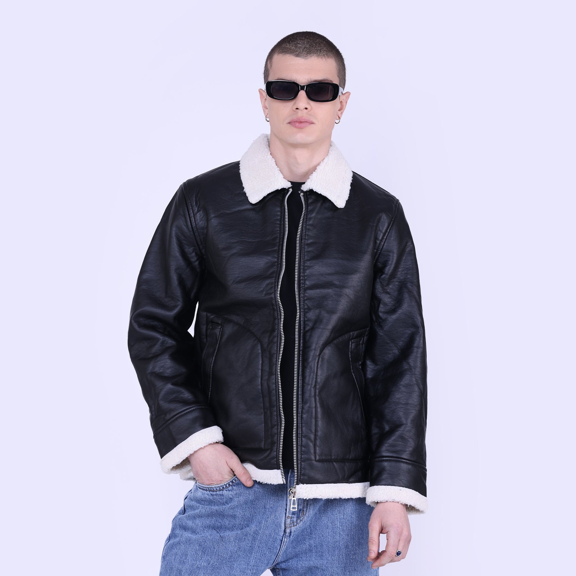 Jacket made of faux leather and shearling lining. Lapel collar and long sleeves. Hip welt pockets. Inside pocket detail. Ribbed trims. Zip-up front.
