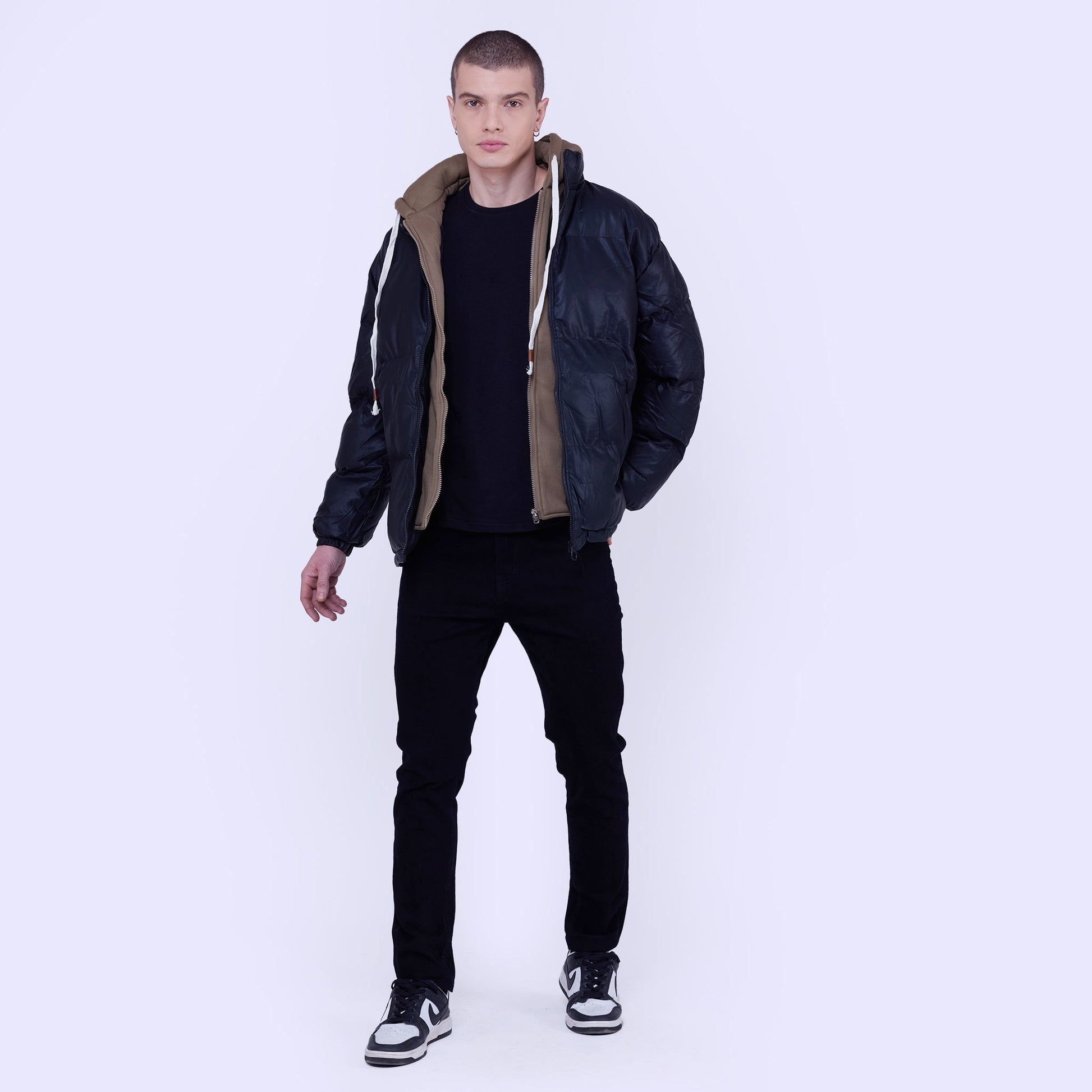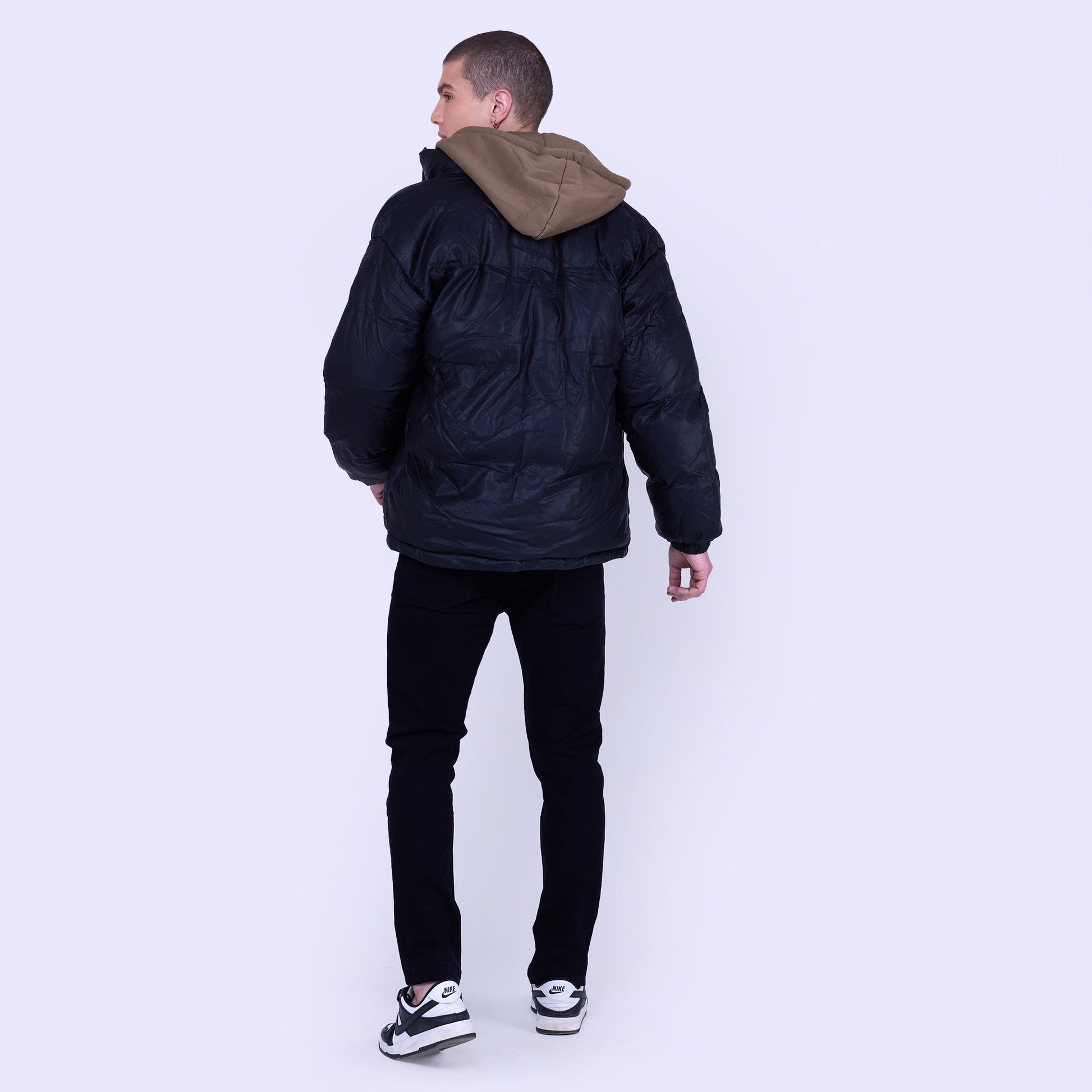 Oversize jacket made of technical fabric with a slightly rubberised finish. High neck and long sleeves with inner elastic cuffs. Zip pockets at the hip and inside pocket. Front zip fastening.
