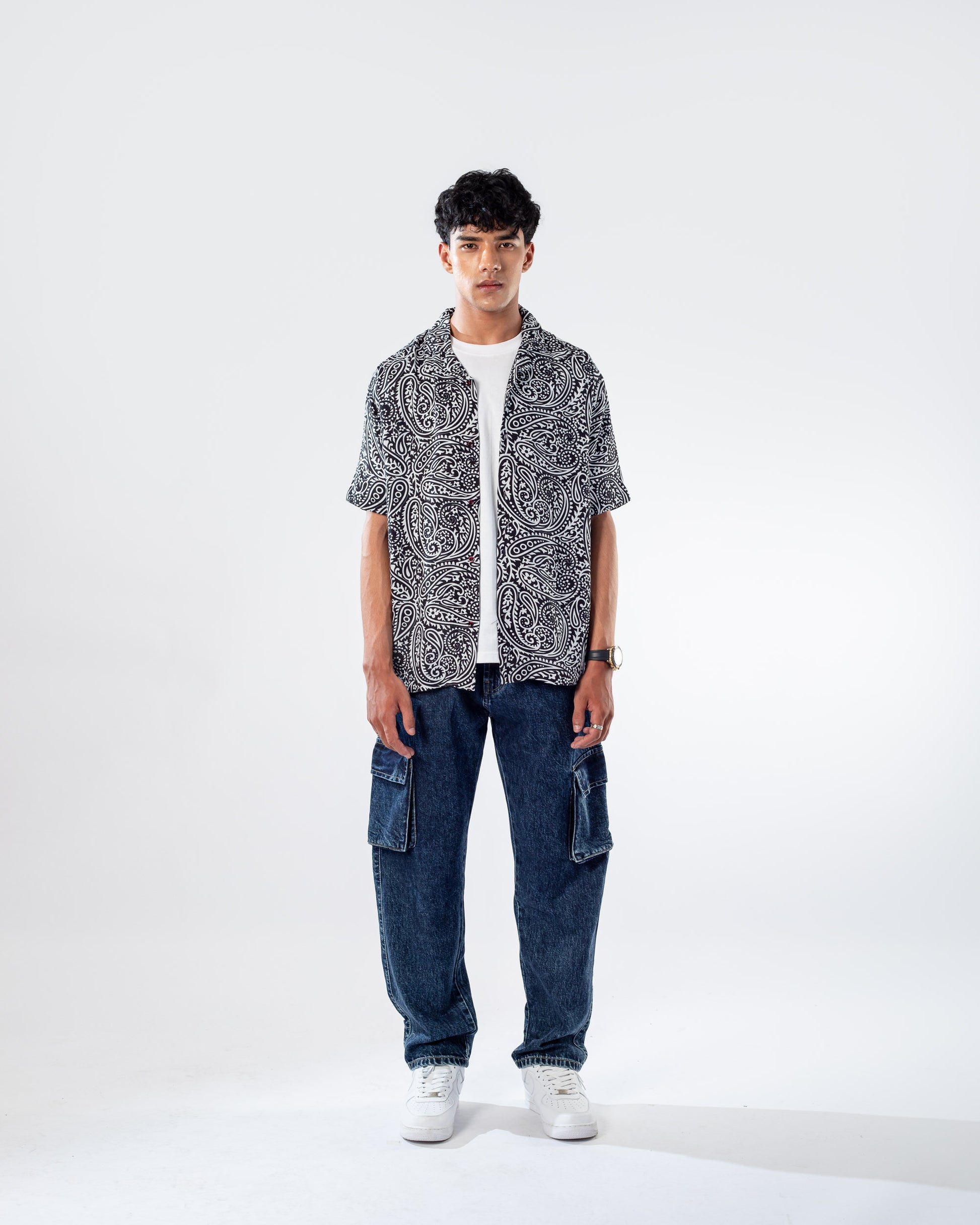 Regular fit shirt made of flowing fabric. Camp collar and short sleeves. Button-up front.