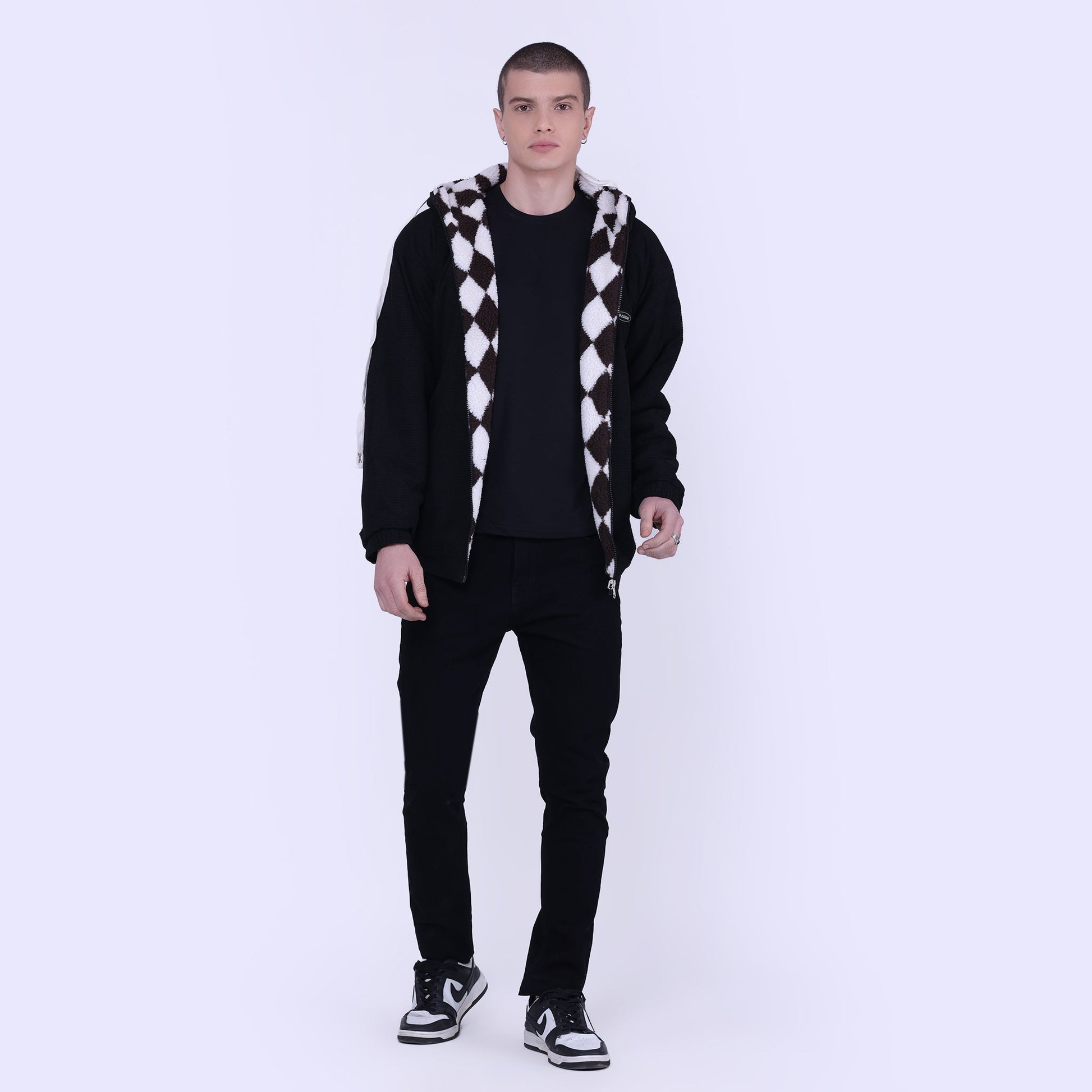 Relaxed fit jacket. High neck and long sleeves. reversible jacket with Contrast trims. Front zip fastening.