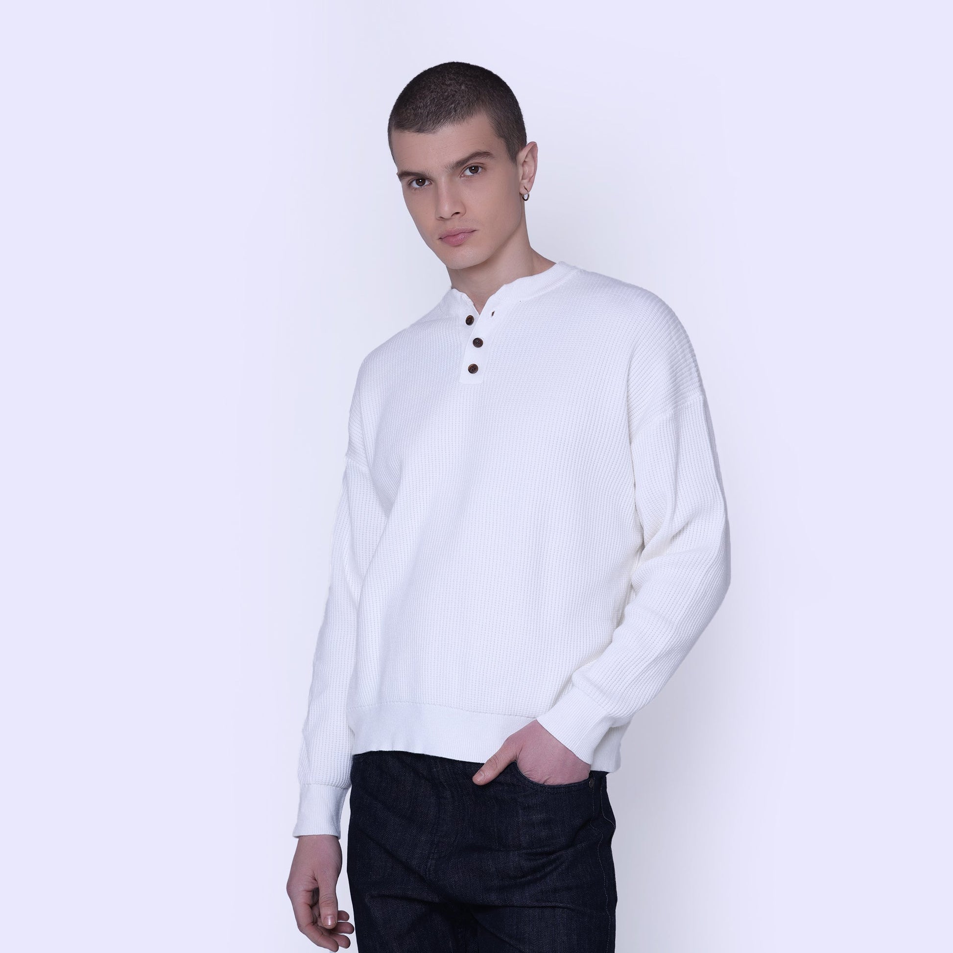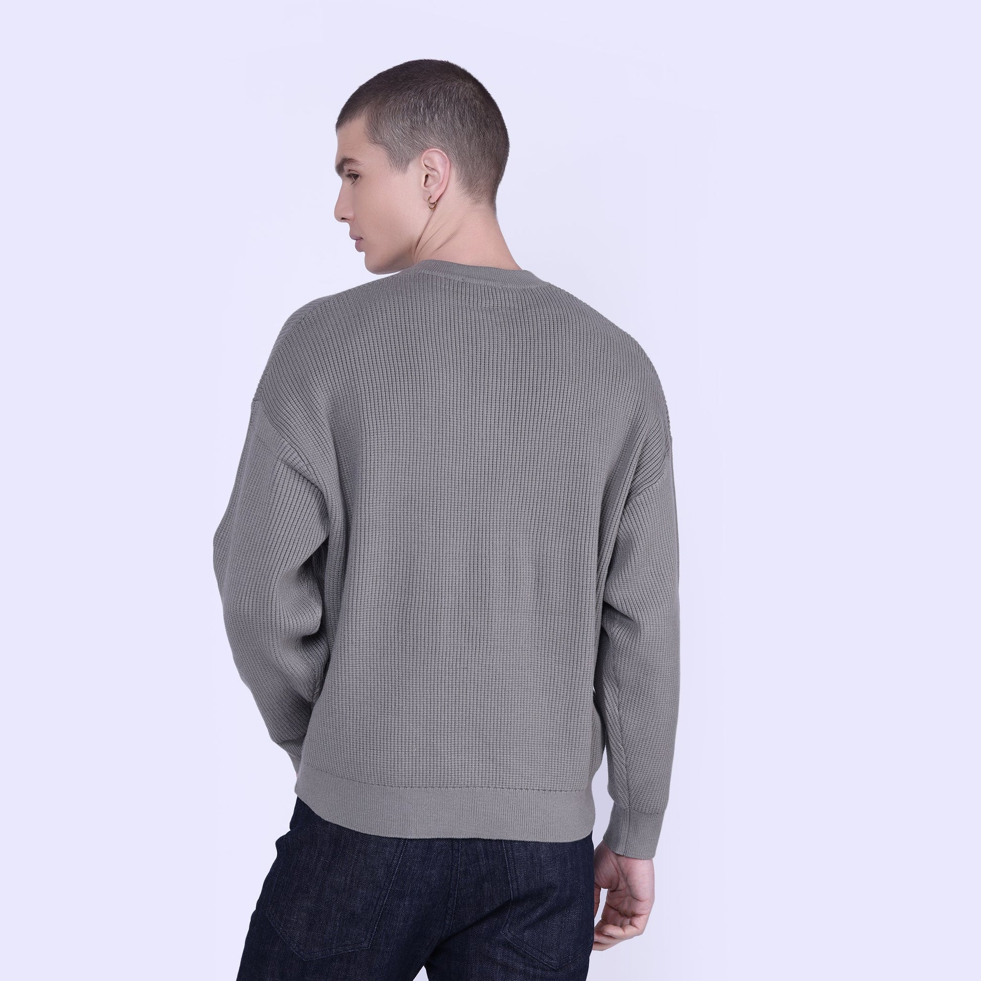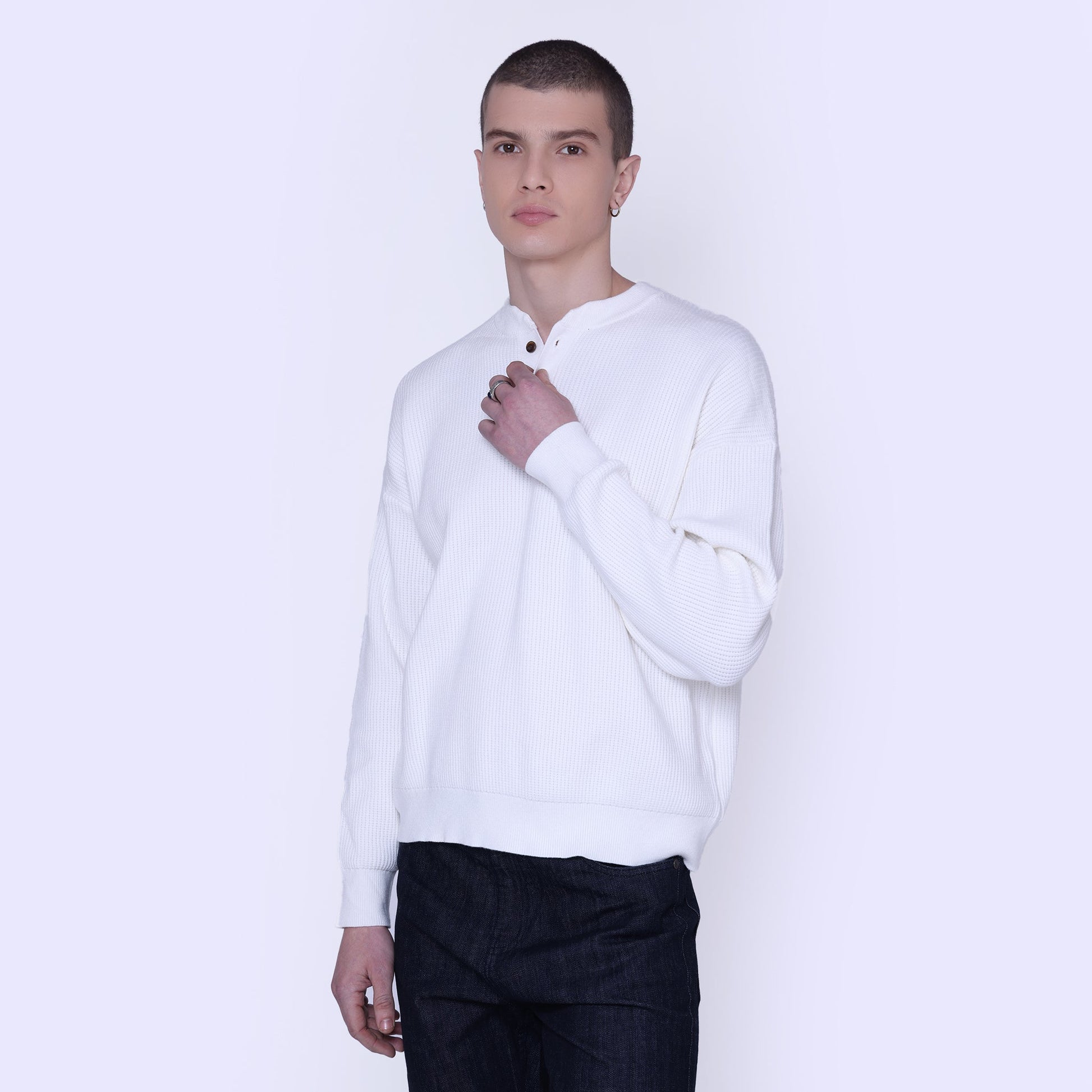 Sweater made of spun cotton fabric. Round neck and long sleeves. Ribbed trims.